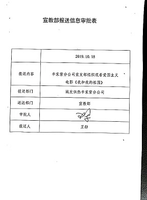 10月17日下午,辛家營分公司黨支部組織全體黨員、發展對象、積極分子、環節干部、共青團員以及職工代表共計58人在電影院觀看了愛國主義影片《我和我的祖國》,以慶祝新中國成立70周年、弘揚愛國主義精神、激發愛黨愛國熱情。