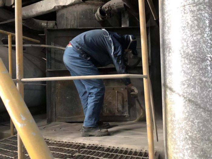 此次清理是從24米高的鍋爐頂部,到0米放渣處,包括渣管內部、鍋爐爐膛風孔、爐門等各個衛生死角,掃帚掃完后又用高壓水槍進行沖洗。