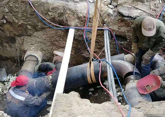 10月15日早晨7點,檢修人員在巡線中又發現了第二處漏點,位置在原搶修基坑西側3米的地方。針對此情況,分公司應急指揮小組立即制定應急搶修方案,決定切割銹蝕嚴重的舊管,準備在舊線旁淺埋DN250新管,延長一定長度后,新舊管道向西在合適位置連通,起到臨時管線的作用。由于地下管線錯綜復雜,施工條件惡劣,經過一周的晝夜奮戰,于10月20日下午,完成了搶修任務,新舊管路連通恢復正常使用,搶修工作告一段落。