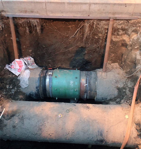 經水樣檢測及GPS定位,確認是補償器漏水,巡檢人員隨即關閉前后段閥門,并將情況上報。分管經理鄭紅飛迅速組織人員進行搶修,于23日上午檢測漏水點為一次網DN800補償器,各單位隨即分工進行搶修。保運單位負責坑道抽水及補償器的切割、打磨工作;檢修車間在漏水點下游進行泄水。