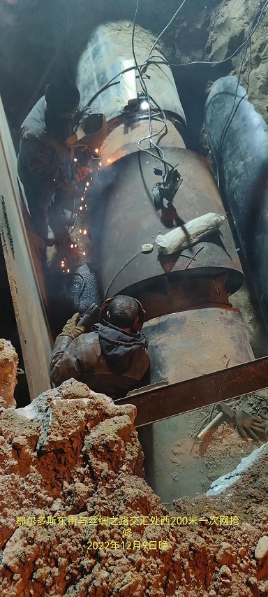 12月8日晚,位于鄂爾多斯東街與絲綢之路交匯處西200米路南公交站牌有熱氣冒出,確定為DN700一次網主管道發生泄漏,決定延用對補償器“包封”的辦法處理漏點。搶修工作于10日凌晨五點完工,又一次成功實現了搶修不停供。